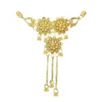 🔷 Features: Handcrafted floral pattern with detailed antique-style metalwork, triple chain tassel hangings for added grace, golden ghungroo embellishments for subtle sound and movement