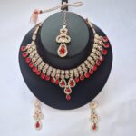 Elevate your traditional elegance with the Majestic Maroon Royal Gold Bridal Jewelry Set, a masterpiece crafted to reflect grandeur and opulence. This exquisite ensemble features an intricately designed gold-tone necklace adorned with floral medallion patterns, each inset with dazzling white stones and deep maroon teardrop embellishments. Paired with matching statement earrings and a coordinating maang tikka, this set brings a complete regal charm to your bridal or festive look.