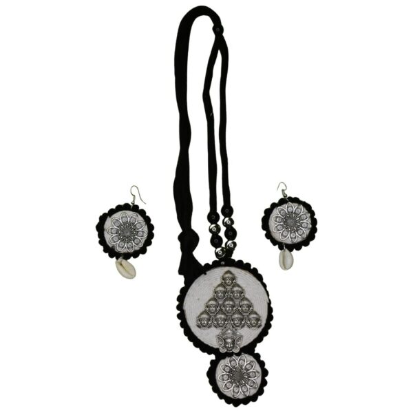 🔷 Features: Handwoven thread necklace with a symmetrical oxidized metal motif pendant, paired with lightweight earrings detailed with floral medallions and cowrie shell accents